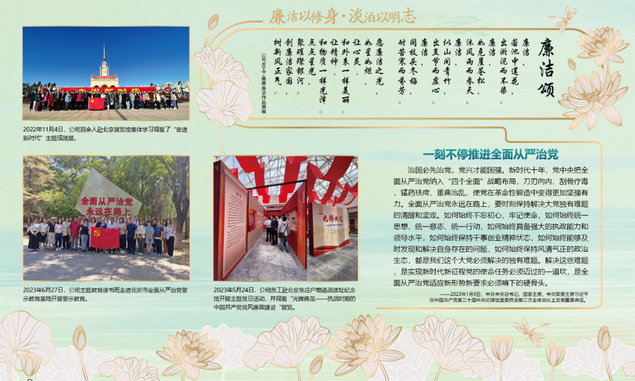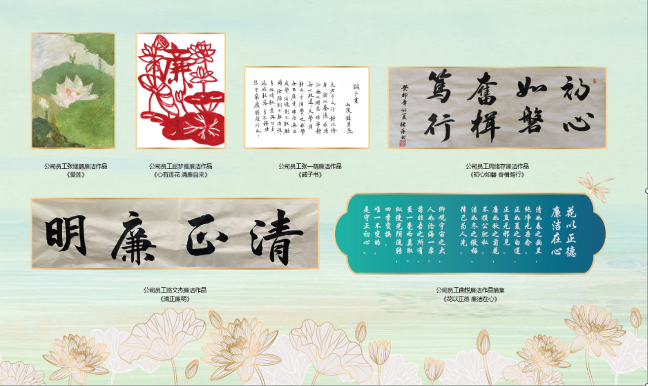 2023年,公司紀(jì)委按照集團(tuán)紀(jì)委工作部署,組織開展“廉潔文化教育月”活動,共征集34篇“清正在德,廉潔在志”主題家風(fēng)家訓(xùn)征文和156件攝影、書法、繪畫等廉潔文化主題作品,以“德鑄忠誠廉潤紫荊”為主題開展廉潔文化長廊建設(shè),把嚴(yán)的要求傳遞到最基層。2025年,推動開發(fā)廉潔文創(chuàng)產(chǎn)品,制作了蓮花主題的桌墊,在廉潔文化主題黨日活動中發(fā)放,受到了公司廣大干部員工的喜愛,通過這一日常工作中高頻率使用的文創(chuàng)產(chǎn)品,最大程度釋放了廉潔文創(chuàng)產(chǎn)品的影響力。